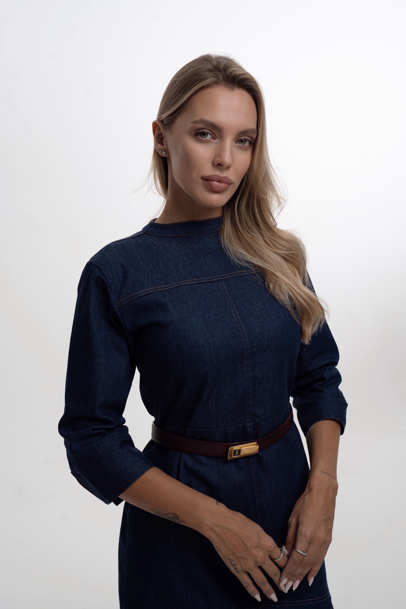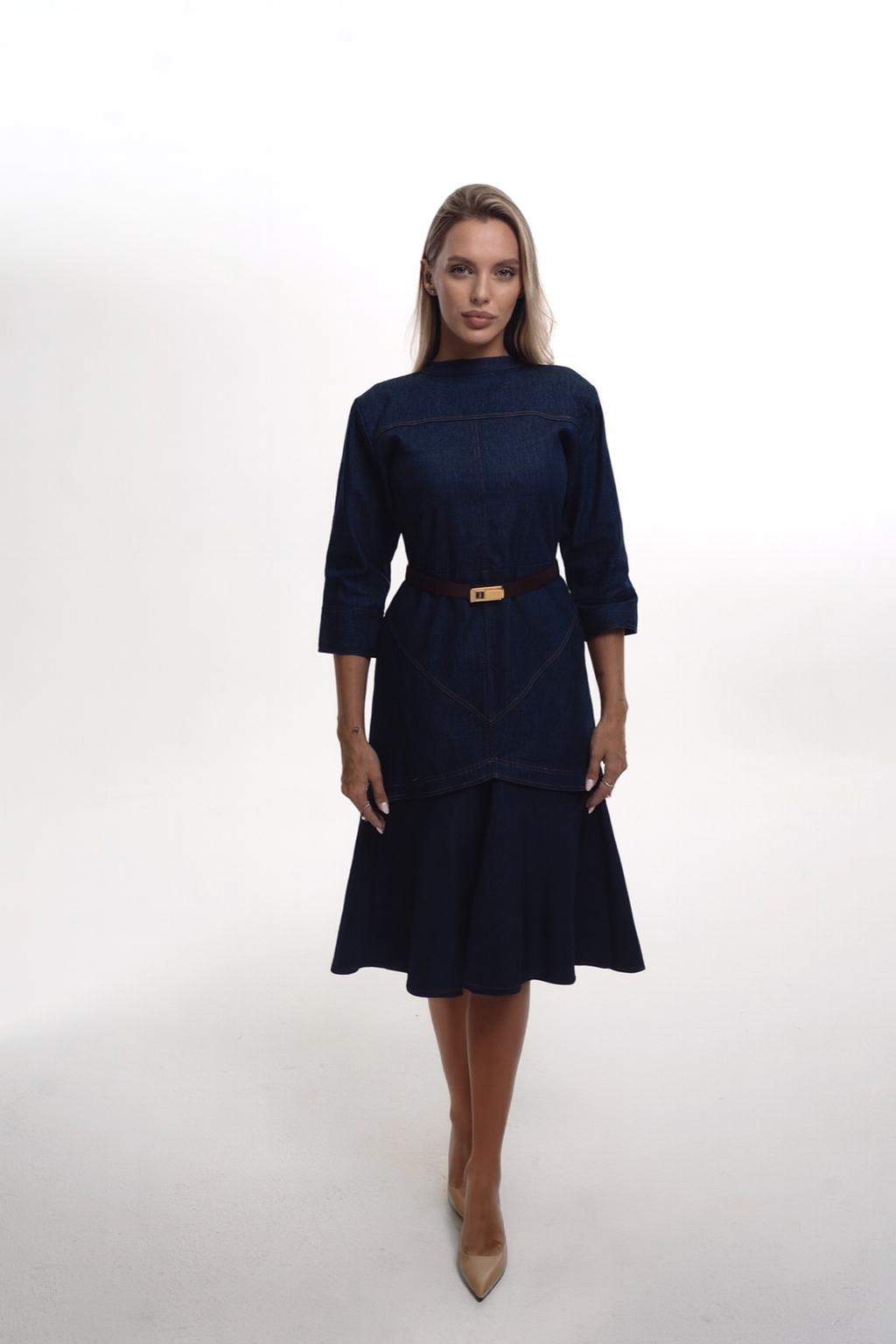 Denim midi dress with 3/4 sleeves, it has a softly flared skirt below the knee and a hidden back zip closure . This dress is perfect for any occasion from casual day out to a night on the town