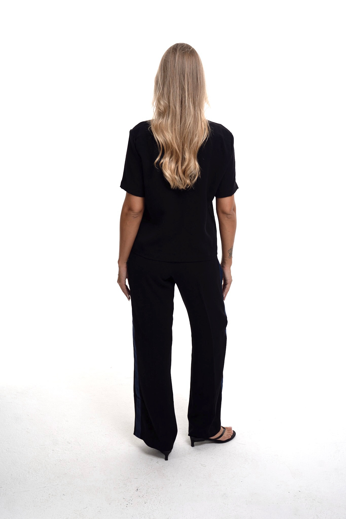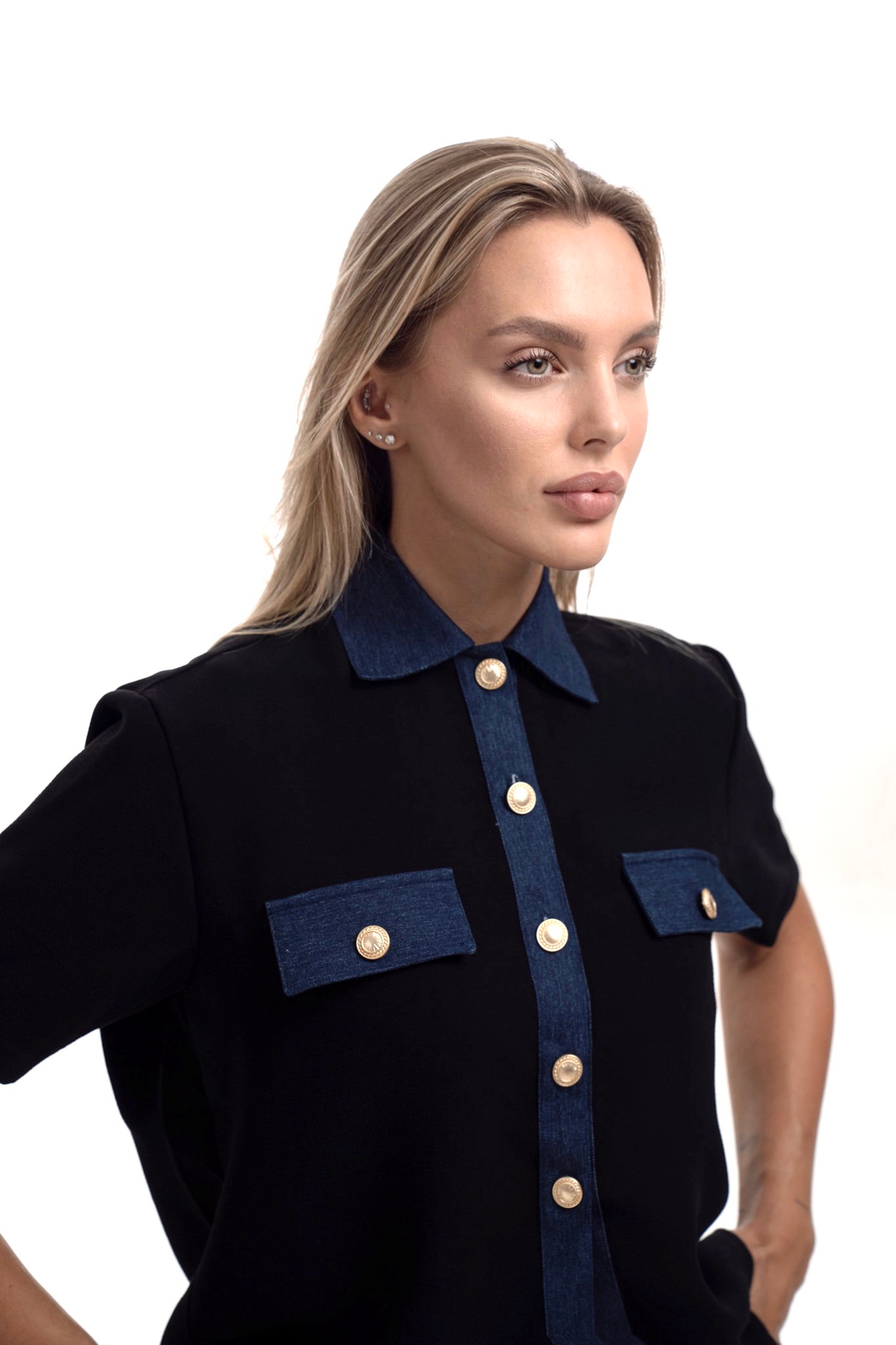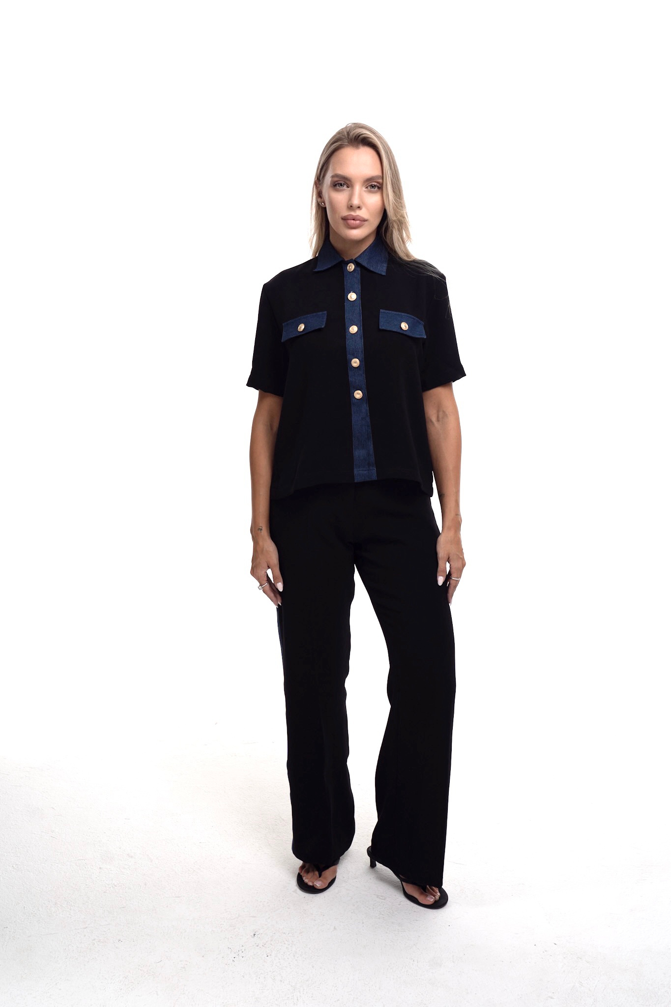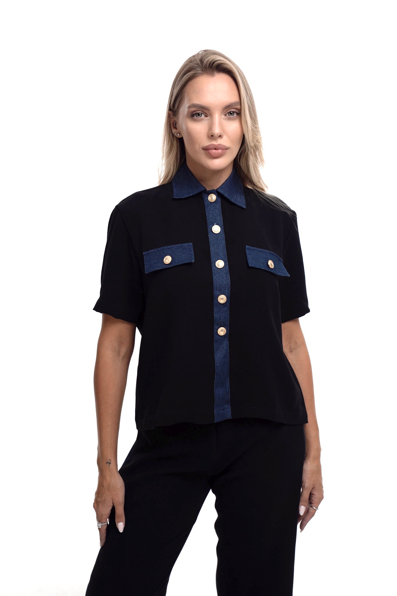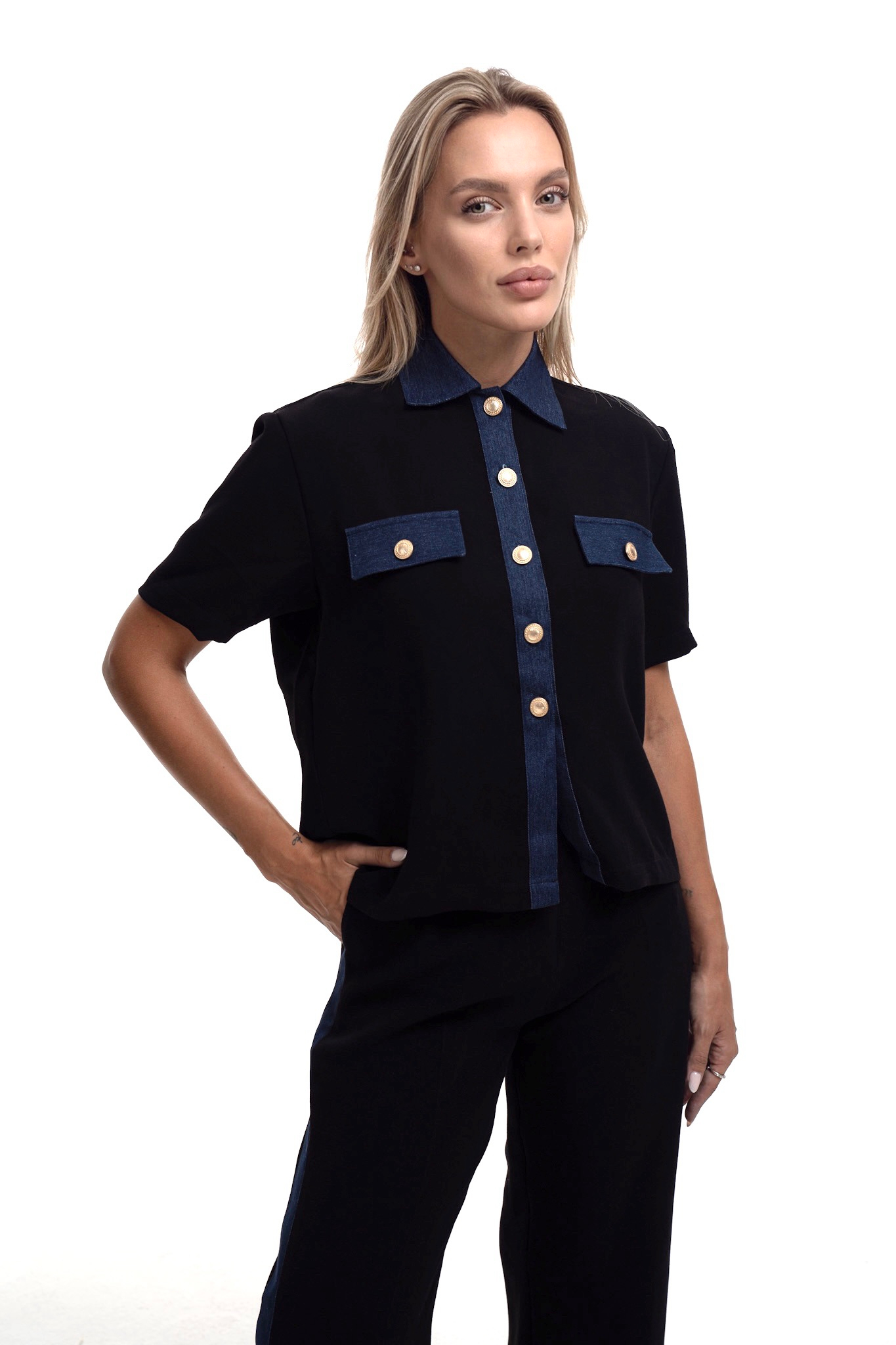 Modern statement of elegance this set blends tailored design with denim detailing. The short sleeve black shirt features a denim collar and flap pockets accented with gold tone buttons paired with straight cut pants for a sleek .
